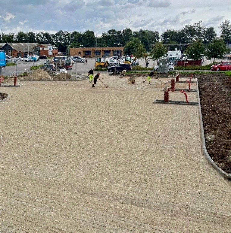 Der opsættes nye kantsten, som definerer ladeparkens areal og giver en klar afgrænsning af kørefelter og parkeringsbåse.